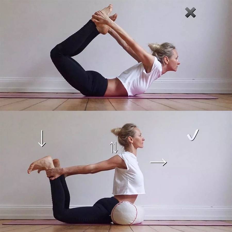 改善:弓式中一定要注意胸腔的上提打開,雙腿向后向上方用力,帶動身體向前向上