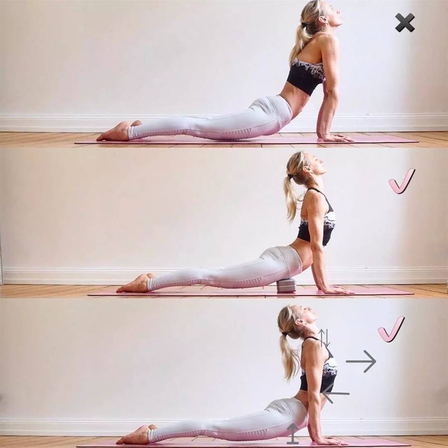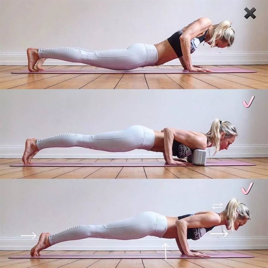 改善:初學者可以借助瑜伽磚來練習,將意識多集中在核心上,雙腳向后延展,頭頂向前延展,形成對拉的力