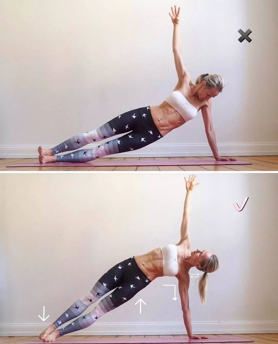 改善:下方腿一定要收緊用力下壓,髖部無法擺正,也可以微微屈膝,注意手臂和上方腿形成一條力線,將身體拉成一條直線。