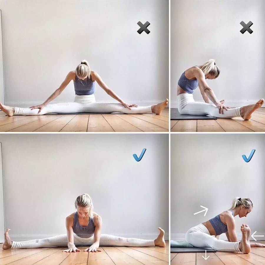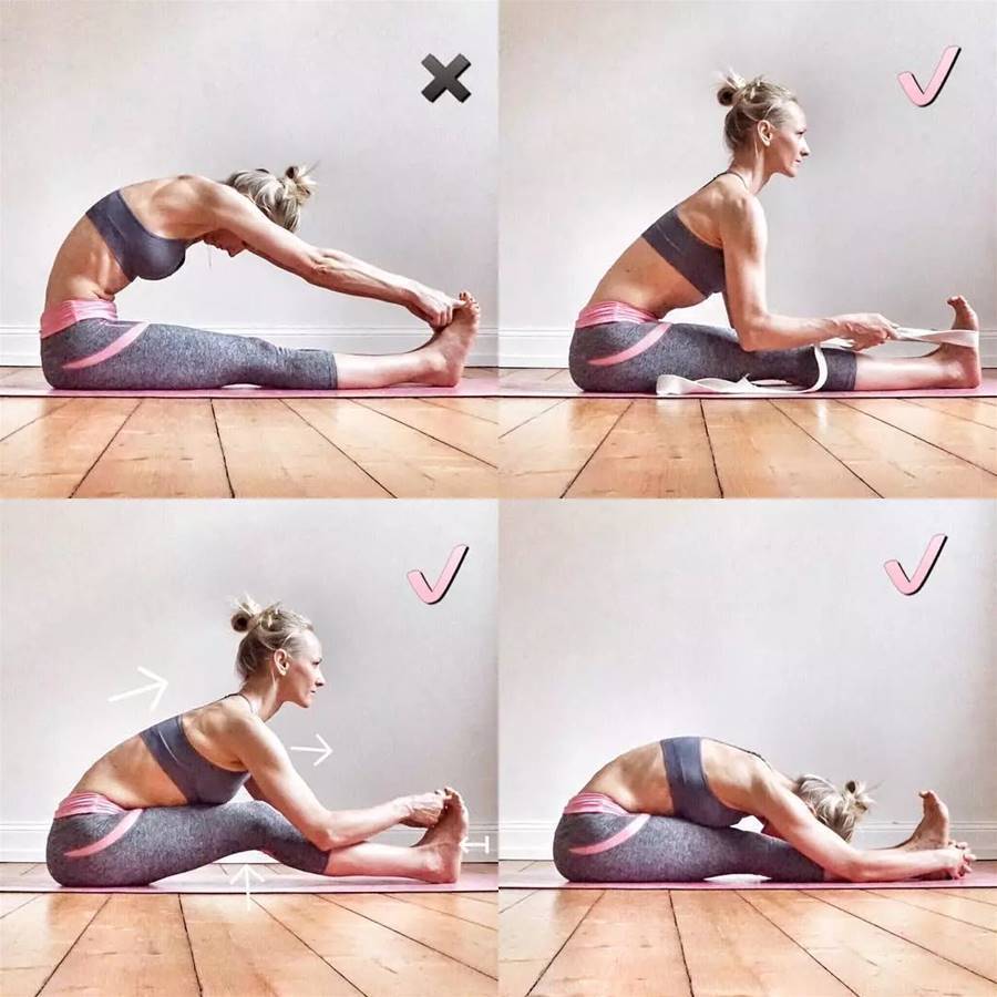 改善:初學者可以借助伸展帶,也可以微微屈膝,先屈髖,前屈,延展背部,然后再慢慢伸直雙腿