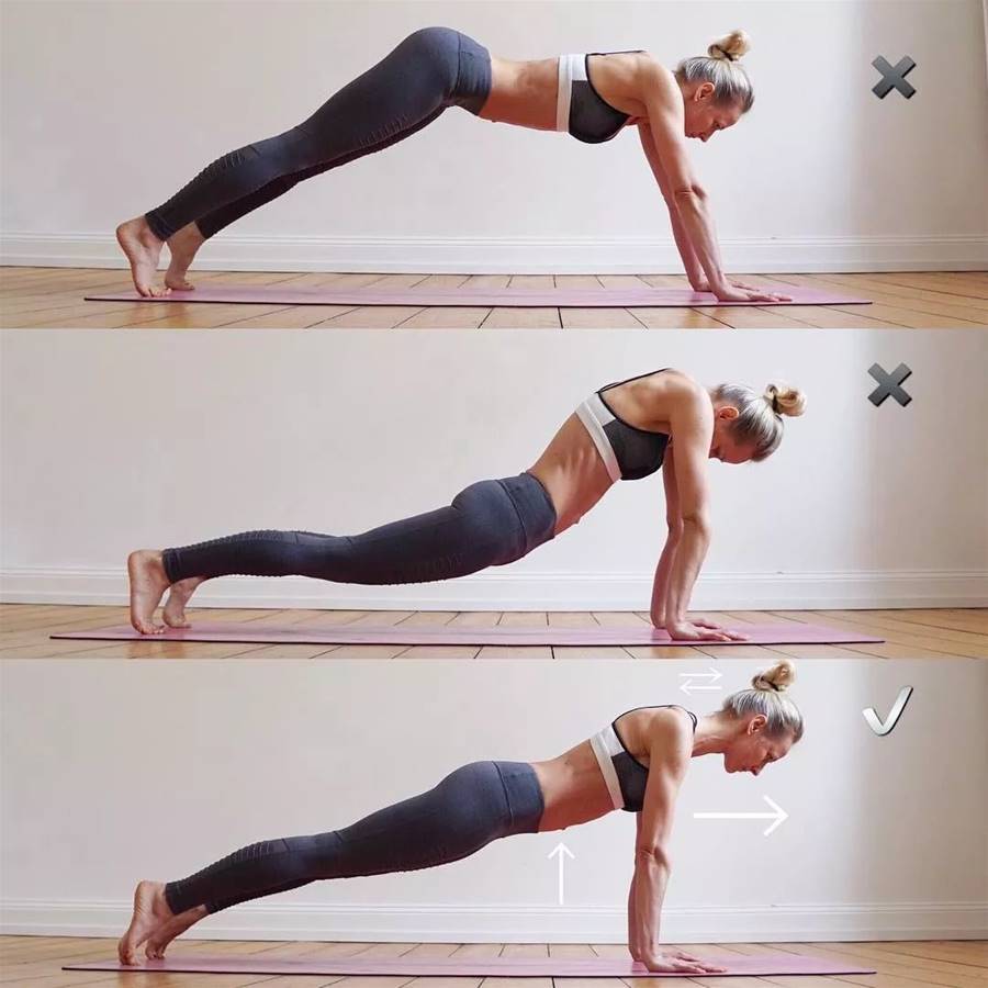 改善:可以先借助瑜伽磚或者是墻壁來輔助練習,保持髖部中正,身體一條線,手臂,雙腿延展
