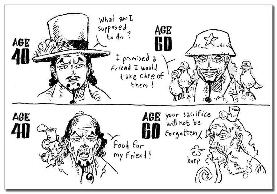除了擬人化之外,尾田還有過人物發展的惡搞,那就是人物正常變化以及走偏的發展變化。
