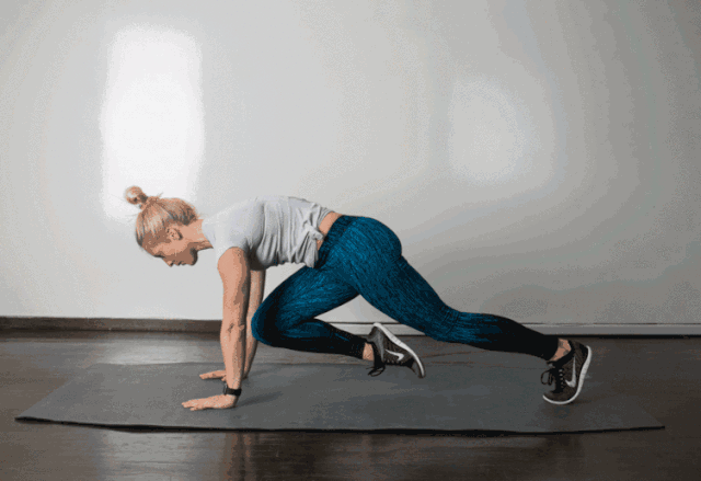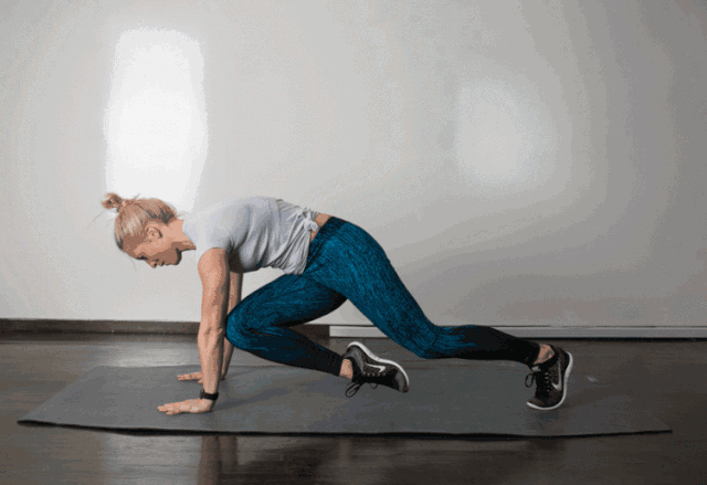 斜板式准备呼气,肚脐贴向脊柱的方向5次呼吸,激活核心屈右膝靠近胸腔,然后伸直还原交换腿,屈左膝,双腿交替练习感觉向在跑步一样,重复练习10-20次