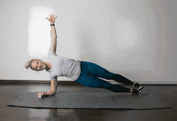 从斜板式开始屈手肘,进入手肘支撑收紧核心,整个身体向右侧打开左手向上伸直,躯干髋部双腿一条直线保持3-5个呼吸,换另一侧或者动态交替练习20-30次
