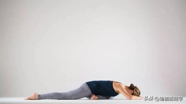 俯卧在垫面上,曲手肘小臂压垫面,大臂与地面垂直进入人面狮身式,保持1-2分钟双手臂向前伸展,胸腔打开进入海豹式,保持1-2分钟动作9: