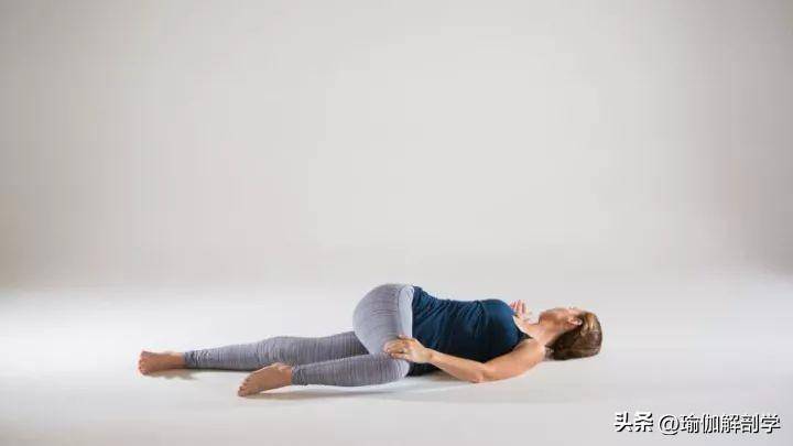 仰卧在垫面上,屈右膝靠近腹部身体向左扭转,左手放在右大腿上转头看向右手指尖的方向身体条件还不错的伽人可以屈左膝,右手握住左脚保持1-2分钟,换另一侧