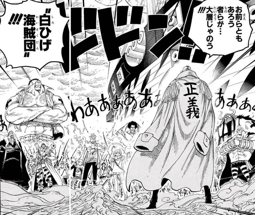 頂上戰爭的時候,赤犬曾和白胡子海賊團正面對峙,當時他和白胡子海賊團干部的站位,跟1088話中青雉和黑胡子海賊團干部的站位一模一樣。同樣都是干部們一直排開,然后對面站著赤犬和青雉,赤犬和青雉都是背對著畫面,就連視角都是一模一樣。