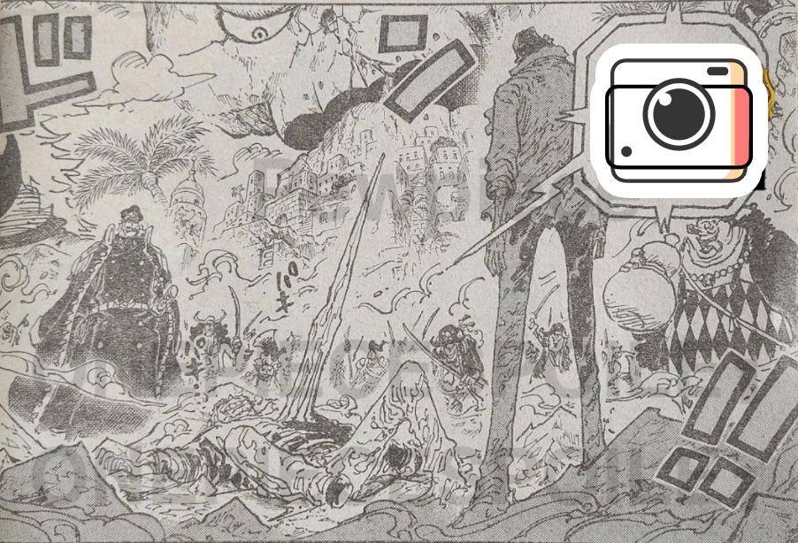 在這一話的結尾,卡普中冰刀后躺在地上,他的周圍站滿了黑胡子團的干部,而這些干部的站位也很有意思,惡政王、雨之希留、巴斯克喬特站在一邊,青雉則站在他們都對面。這樣的站位不由得讓我想到了頂上戰爭的一個畫面,那個畫面和青雉的畫面可以說如出一轍。