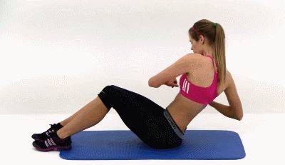坐姿状态,双脚交叉,膝盖微微弯曲,如图所示。双手紧握,同时腰腹收缩,身体左右进行扭转。动作进行15次,重复4组。
