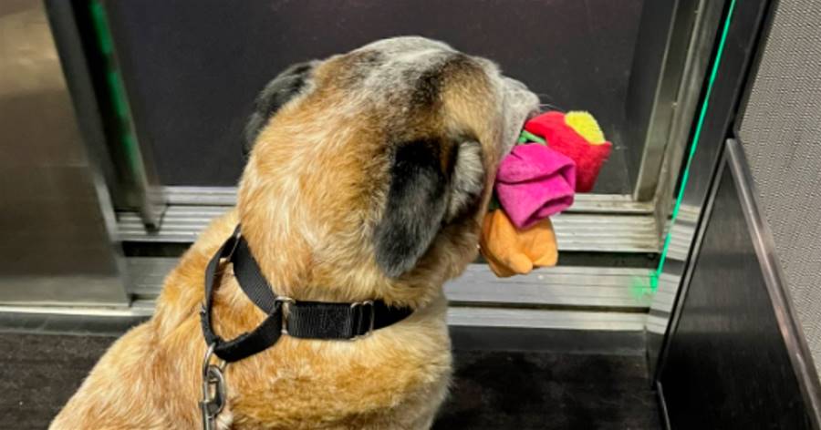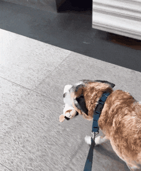 就是每次散步的時候,都會叼著一個玩具,就像它第一天回家時那樣。
