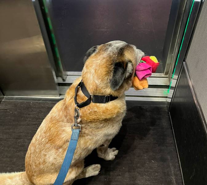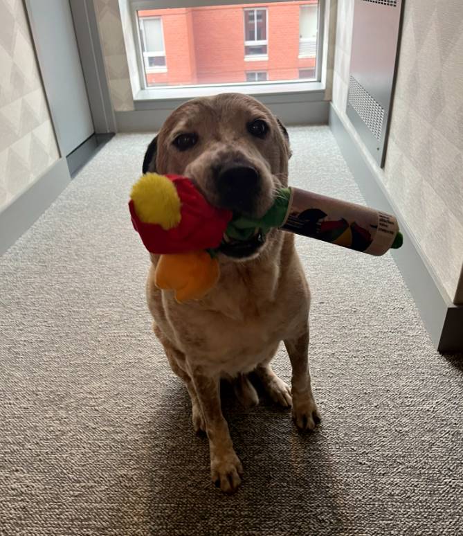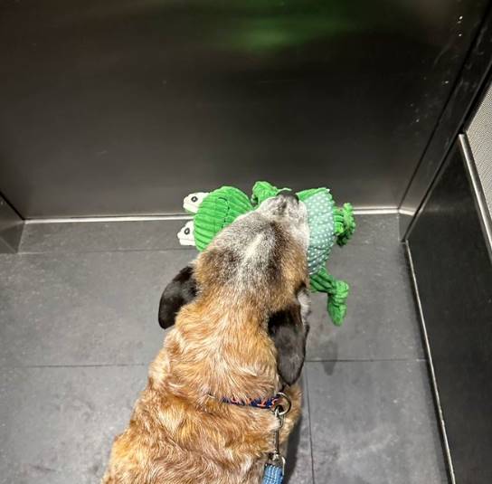 它超愛這個玩具,全程叼在嘴里,跟新主人一起來到了它的新家。