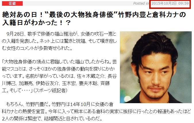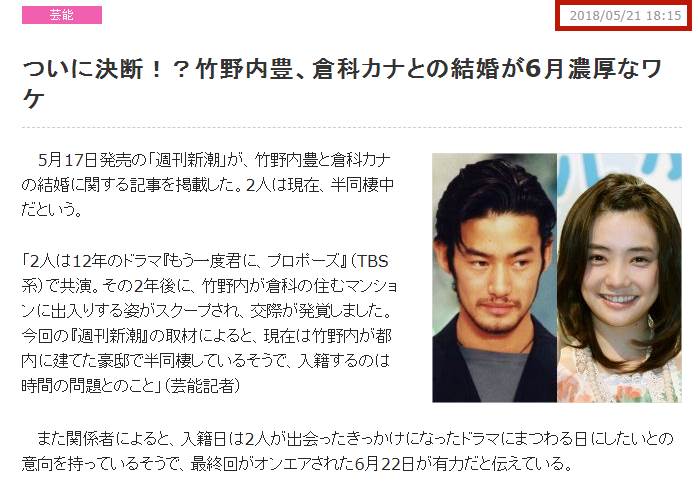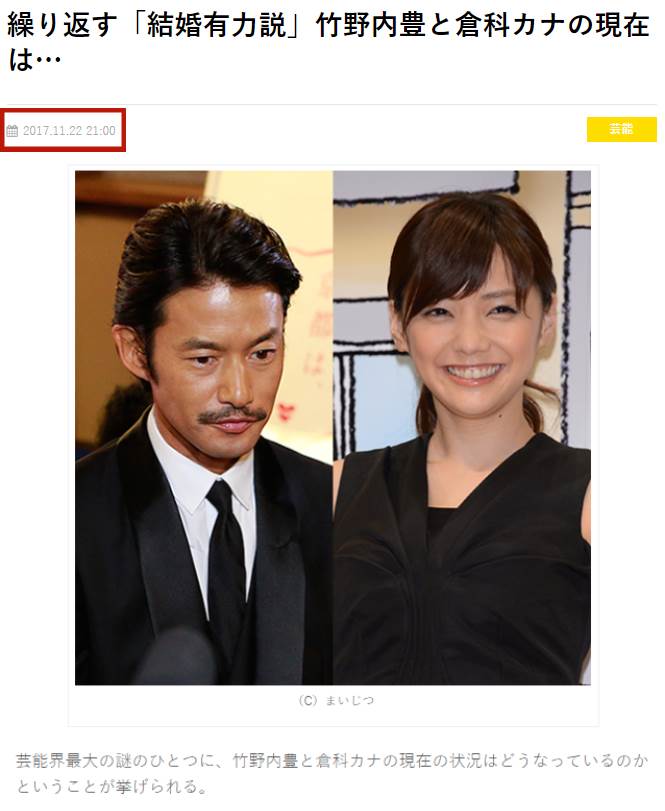 2014年10月,周刊FRIDAY拍攝到了竹野內豐進入倉科加奈公寓的場景。