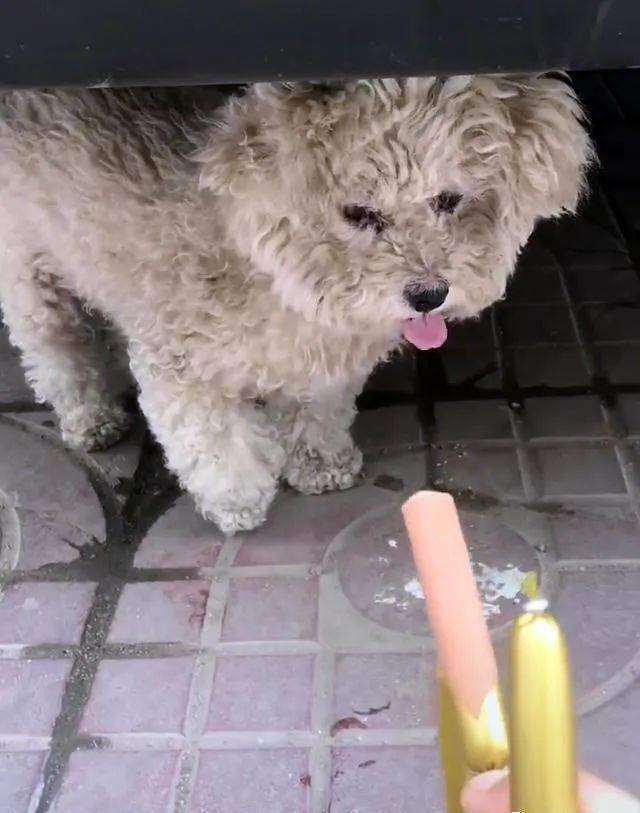 第二天,鏟屎官帶著好幾根火腿腸去找那只流浪比熊,小家伙依然在昨天的那個位置。