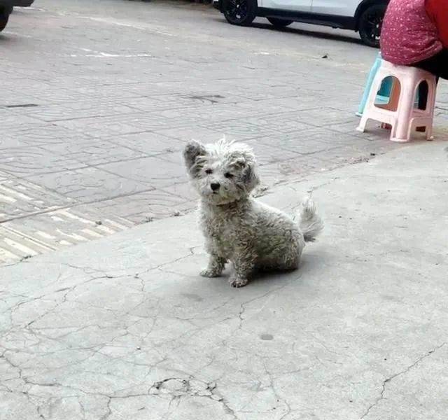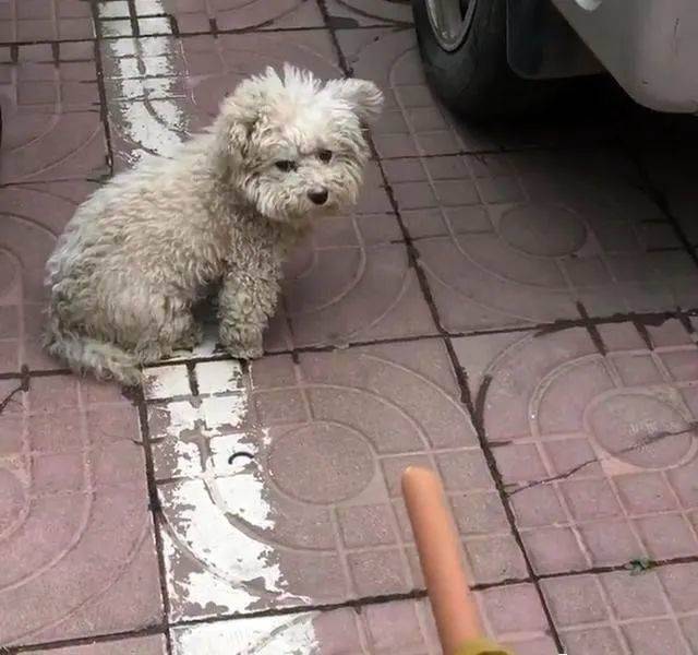 小家伙一動不動地坐在地上,像一只可愛的玩具小熊,與之形成鮮明對比的,是臟兮兮已經打結的皮毛,這讓鏟屎官生出了惻隱之心,有了帶它走的想法。