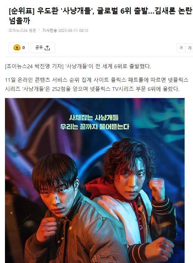 6月11日,据韩国媒体报道,截止11日的数据显示,Netflix韩剧《猎犬》,在Netflix电视剧类别中排名第6位。因酒后驾车事故,引起韩国热门话题的女演员金赛纶,再次成为韩网话题,作为原先该剧的女主角,黯然退场,但是当时韩剧《猎犬》已经拍摄完毕。