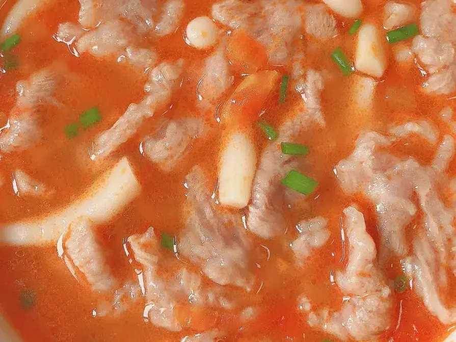 水燒開后,放入腌制好的肉片煮三分鐘,煮熟后撒上蔥花即可出鍋開吃。