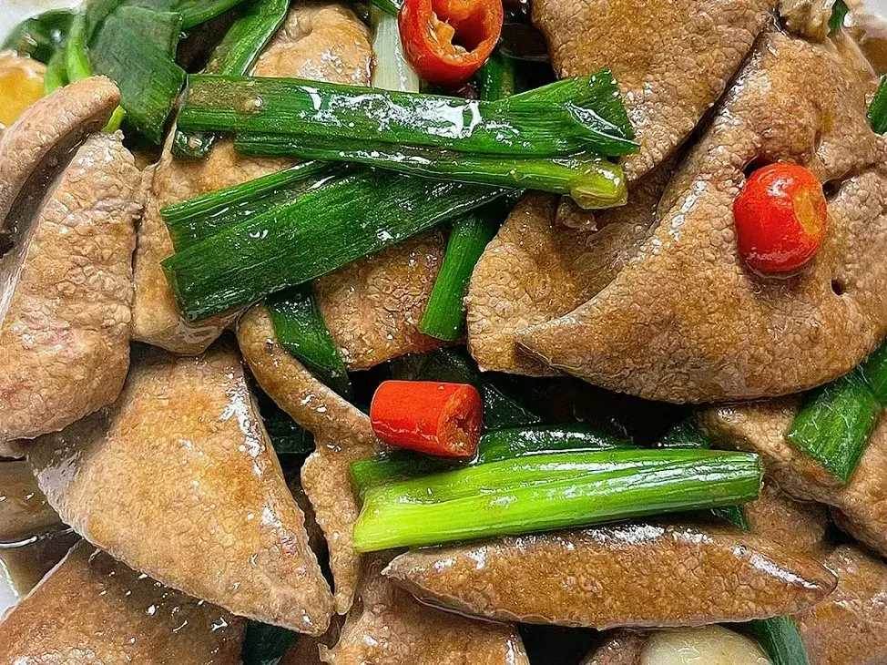 準備食材:豬肝,蒜苗,姜片,蒜片,小米辣,醬汁。