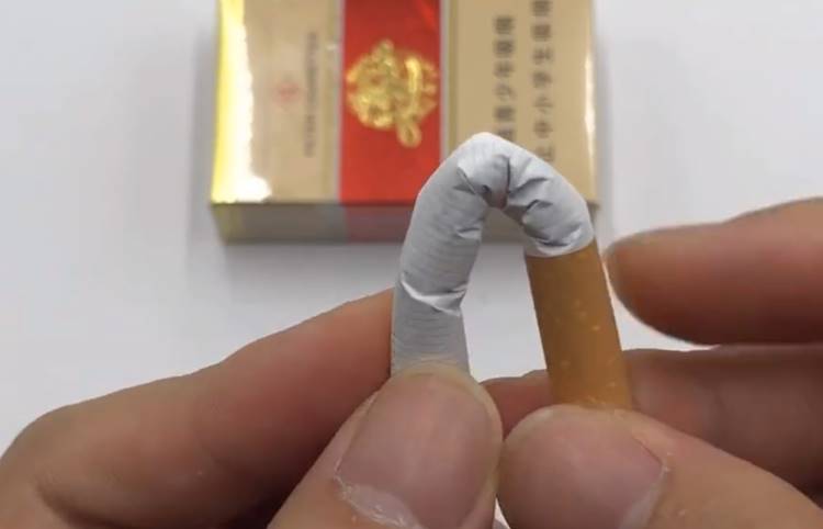 最后一個方法,由于制作香煙的煙絲比較特殊,我們把香煙對折一下,可以看到煙絲完好無損,韌性非常不錯.