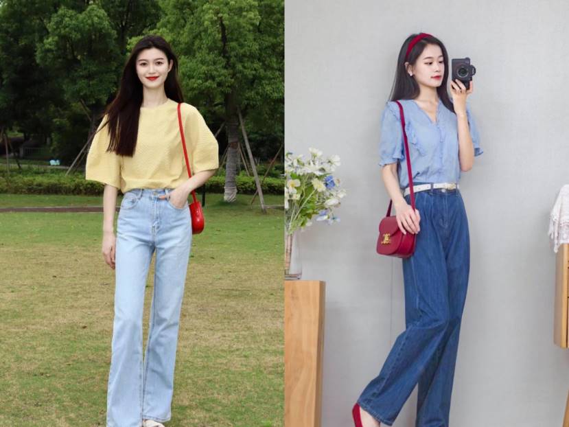 藍色的上衣比牛仔褲顏色淺,形成了層次感。再搭配一個紅色斜挎包,增添一絲的沉穩。