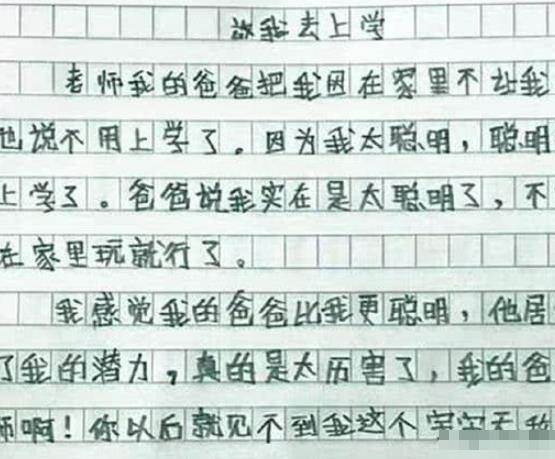 第三篇文章中,學生的題目是《讓我去上學》,學生也不知從哪里開的腦洞,說自己的爸爸把自己困在家里不讓他出門,因為爸爸說覺得他實在是太聰明了,所以根本就不用上學了~~~但是這不是重點,學生孩因此洋洋得意,說自己覺得自己的爸爸才聰明,因為爸爸發現了他的潛力,這位學生的臉皮到底是有多厚啊?家長改試卷的時候就已經氣得火冒三丈了,家長也是十分憤怒的說:再這樣放牛去~~~