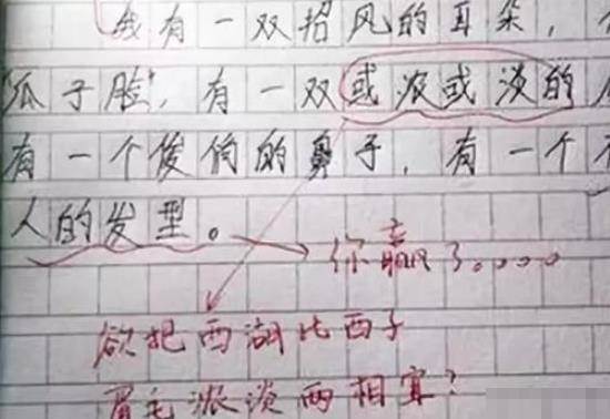 第一篇作文中,學生在文章中就是介紹自己,而學生介紹的就是自己的五官,學生說自己有一雙招風的耳朵,還有一個「瓜子臉」,最后問題來了,孩子表達自己有一雙或濃或淡的眉毛~~~最后的結束語也是很搞笑,說自己有一個不可告人的髮型~~~學生這個形容可真是夠玄乎的,難道學生學會了化妝,所以形容起來才這麼的「玄乎」嗎?老師后面也是點評道:變色龍同學,你好!