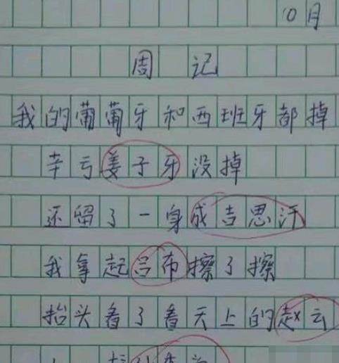 第二篇作文中,學生其實就是要描述一件事,就是自己的牙齒掉了,但是這位同學就是不走尋常路,他用「諧音離世名人」來寫這篇文章,說自己的「葡萄牙」和「西班牙」掉了,幸虧「姜子牙」沒有掉~~~還說自己留了一身的「成吉思汗」,不得不說學生還是蠻新穎的,但是這是寫作文,偶爾用一個這樣類似的詞就可以了,但是整篇文章都是這樣的寫作風格,如果不是老師理解力比較好,懷疑根本就不知道學生到底要表達什麼意思吧~