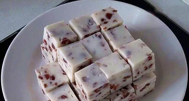 第四步,到了時間,可以從冰箱里取出模具,切成小塊吃,也可以撒椰子蓉,味道更好。
