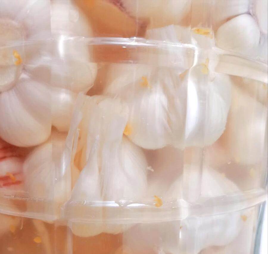 用到:鮮蒜5斤、鹽70g、冰糖800g、米醋1200ml、高度白酒50ml、清水1000ml