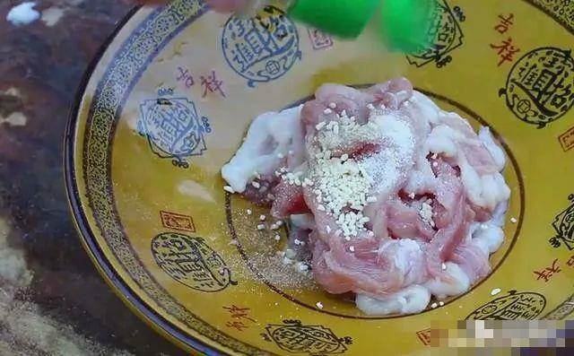 五花肉切好之后,我們放入碗中加入少許鹽,雞精,胡椒,蠔油,老抽,紅薯粉。