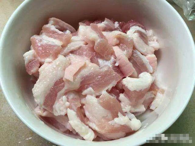 買來的五花肉首先將肉肥的部分切去,再將瘦肉片切成薄片。