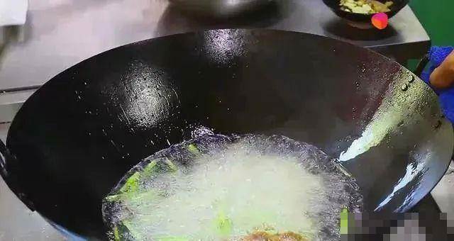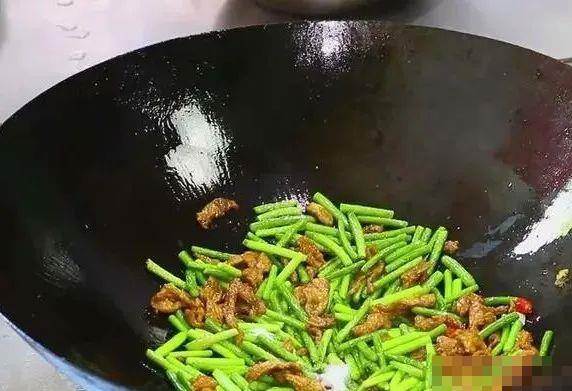鍋中留底油,倒入姜蒜,小米辣爆香,最后給點清水,放入炸好的蒜苔和肉絲