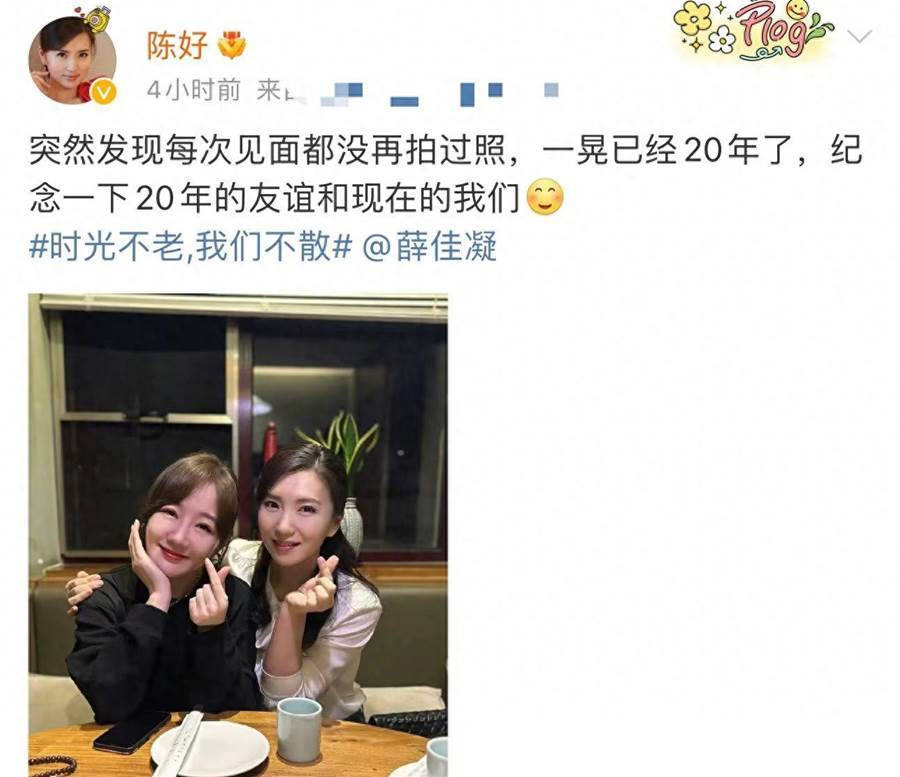 9月22日,許久沒有曬照的陳好,突然在社交賬號上發布一張與薛佳凝的合影,并感慨地表示「突然發現每次見面都沒再拍過照,一晃已經20年了,紀念一下20年的友誼和現在的我們」,引來網友們的回憶殺。