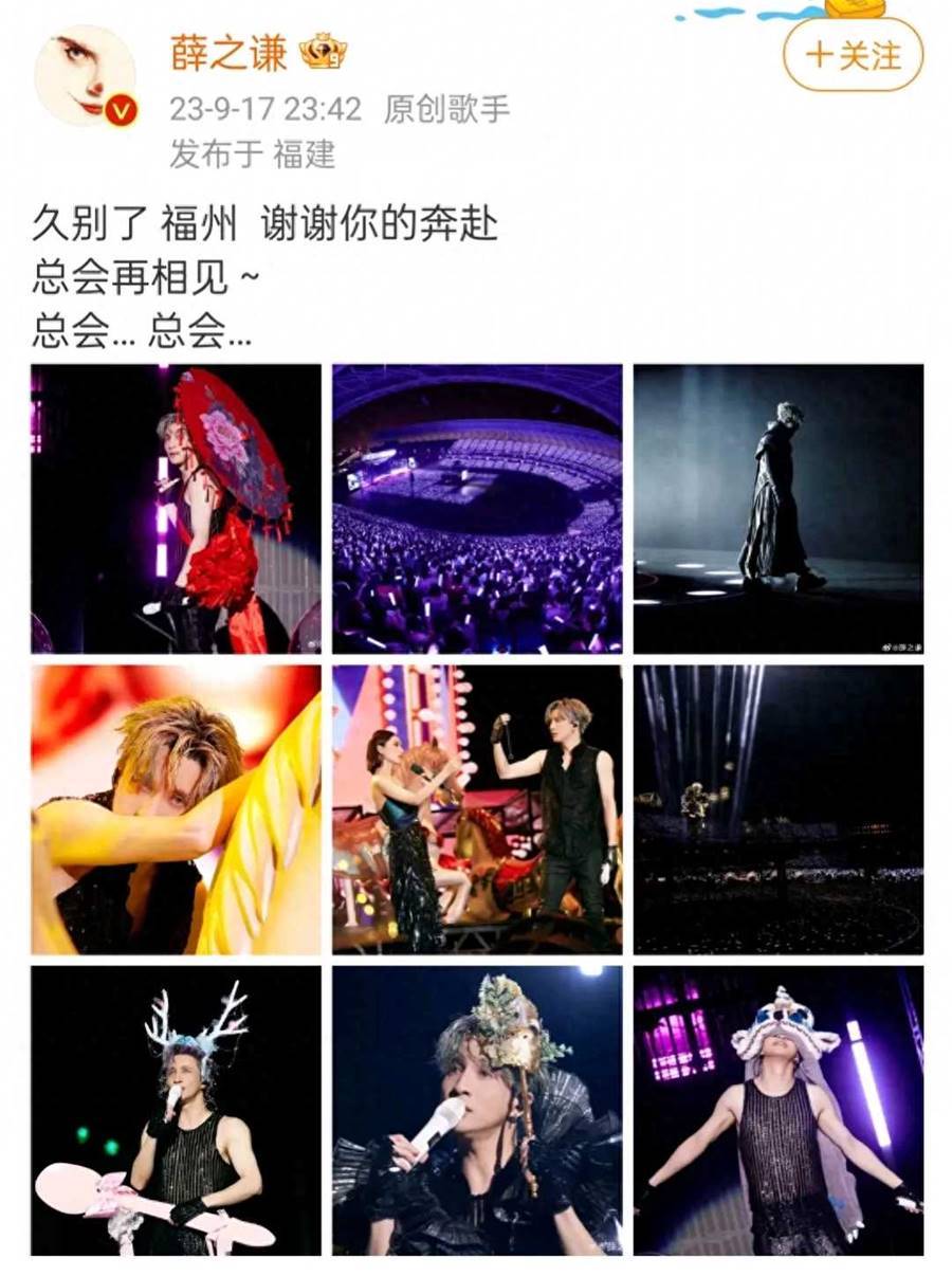 9月17日,薛之謙發文告別福州演唱會。薛之謙寫道:「久別了,福州,謝謝你的奔赴,總會再相見~總會… 總會… 」