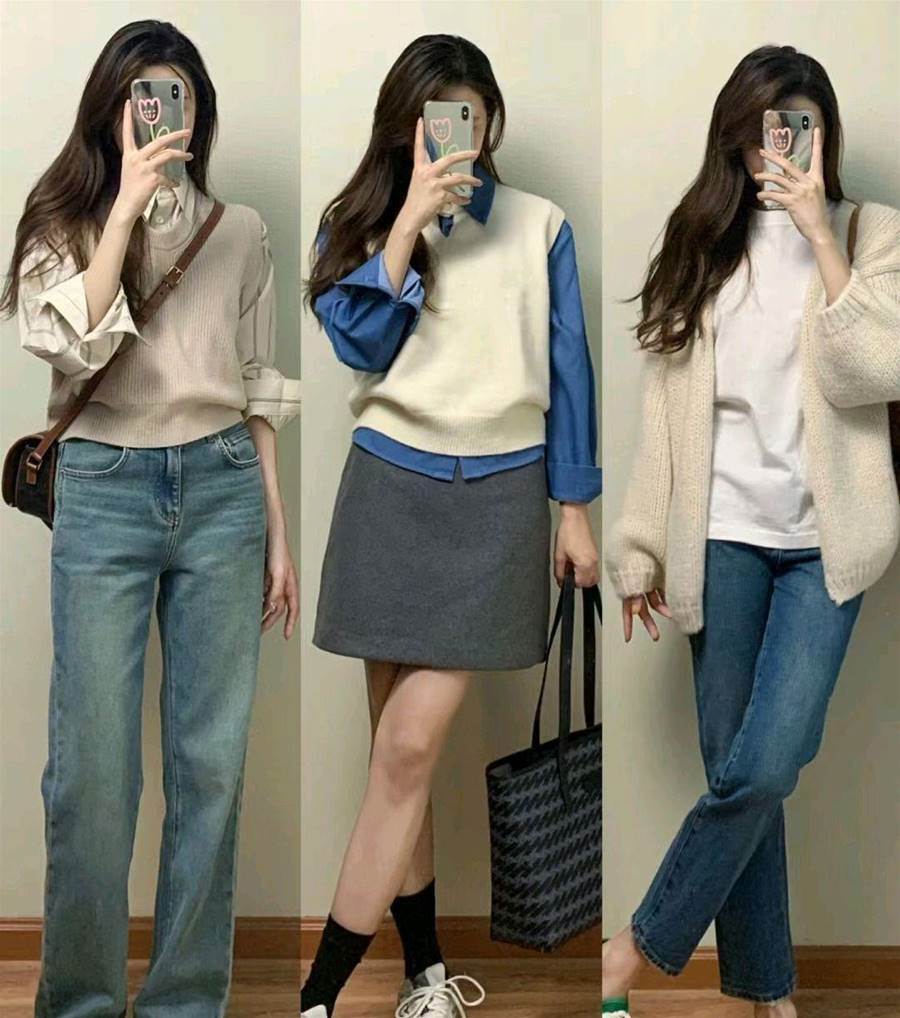 克萊因藍色的襯衫,顯白效果不錯,又很帥氣,疊穿米白色的針織馬甲,層次豐富,配色又特別清麗干凈,減齡又耐看。
