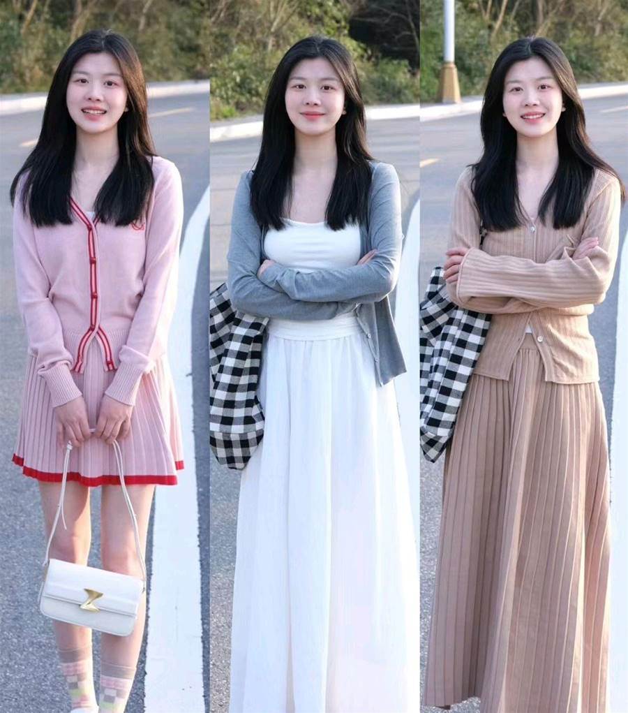 茱萸粉色的針織衫,搭配同色同材質的百褶裙,單一的配色往往可以穿出高級感來,又顯得很優雅安靜,很有書卷氣。