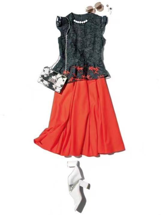 思路二:逆勢而為比起順,逆勢而為的搭配思路,是一種激進的冒險,比較危險。如同黑色華麗小衫+紅色傘裙,靈感沒錯,錯在款式。