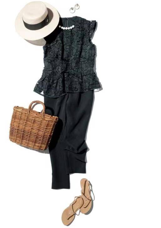 手法二:+小黑褲一身黑色,幸好有面料、細節亮點的化異求同。簡繁相間,風格卓然。借助米色涼鞋、編織包、禮帽,時髦姿態可見端倪。