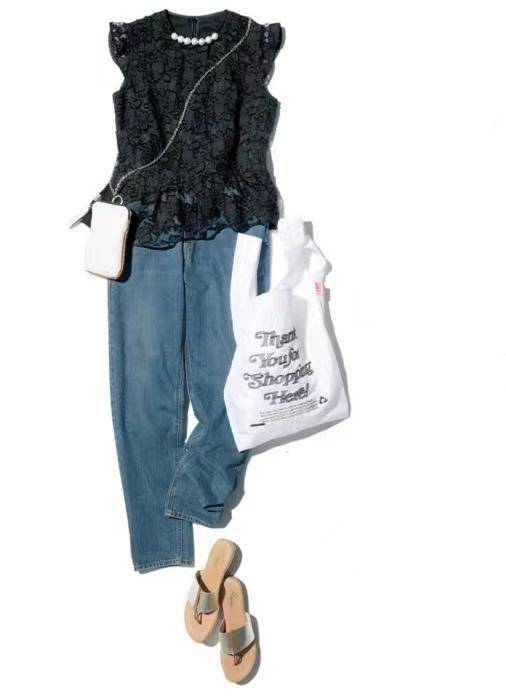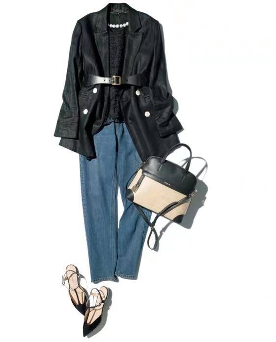 保持黑上衣+牛仔褲不變,加件黑西裝,通勤公文包和精致涼鞋伺候,化身職場時髦精。鞋包一換,風格隨之變幻。
