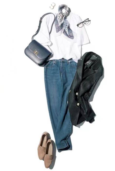 風格二:直曲混搭加點中性,調和些精致,即是休閑白T恤與牛仔褲的直曲混搭大賞。印花絲巾、米色樂福鞋,首飾,精致小包,處處透著不俗。