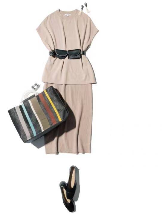 也可以豪邁些穿,束一款黑色腰包,腰線、亮點和盤托出,有一箭數雕之妙。特意用黑底拼色大包包增加量感與存在感,以調和米色的柔和,突出風格。