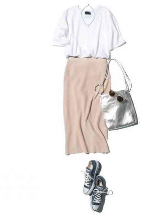 風格四:優雅風如果想要精致,白T恤怎麼穿?正好,一條冰絲直筒裙就是它的絕佳搭檔。米色,利落H型,不由分說寫滿干練與高雅。