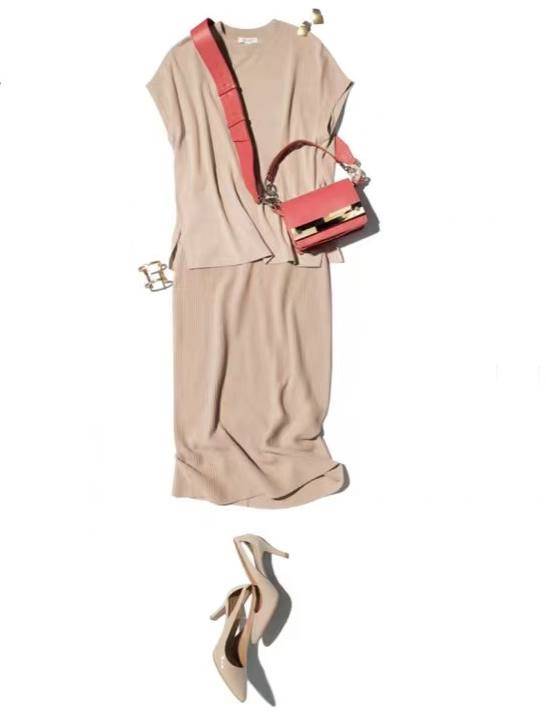 ② 冰絲套裝套裝式的時髦穿法,重點在靈感妙思。以這套米色冰絲套裝為例,亮點全在配飾中。比如,珊瑚粉小包包,精致且個性,粗帶+小廓形,對比鮮明,頗有時尚特色。