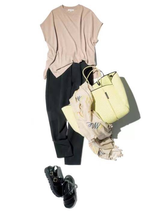 再換雙黑色潮酷涼鞋,儼然休閑作派。特意用黃色大包包和絲巾點綴,于柔和米色中脫穎而出,大量感+配色呼應,小細節、大時髦。
