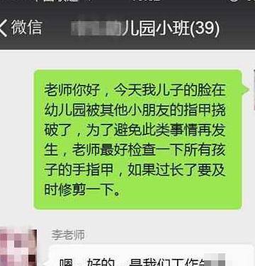 媽媽詢問了兒子,得知確實是在幼兒園與小朋友玩游戲時被撓傷。于是媽媽想著告訴老師這件事,借此提醒一下老師檢查并修剪孩子的指甲,免得又撓傷別的孩子。