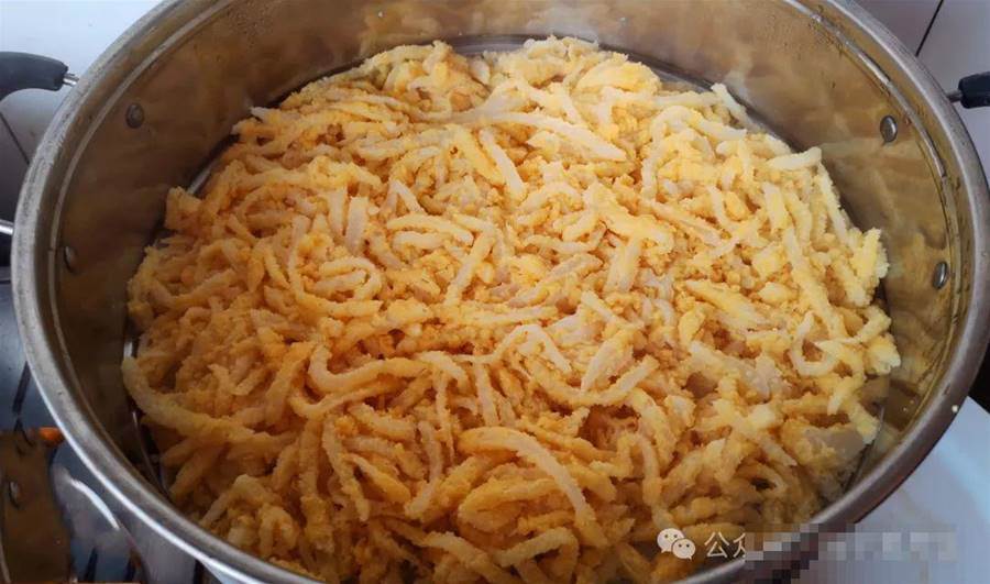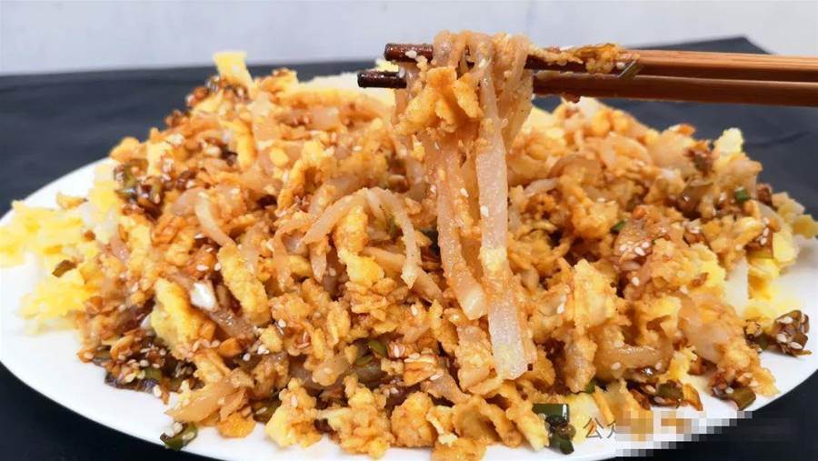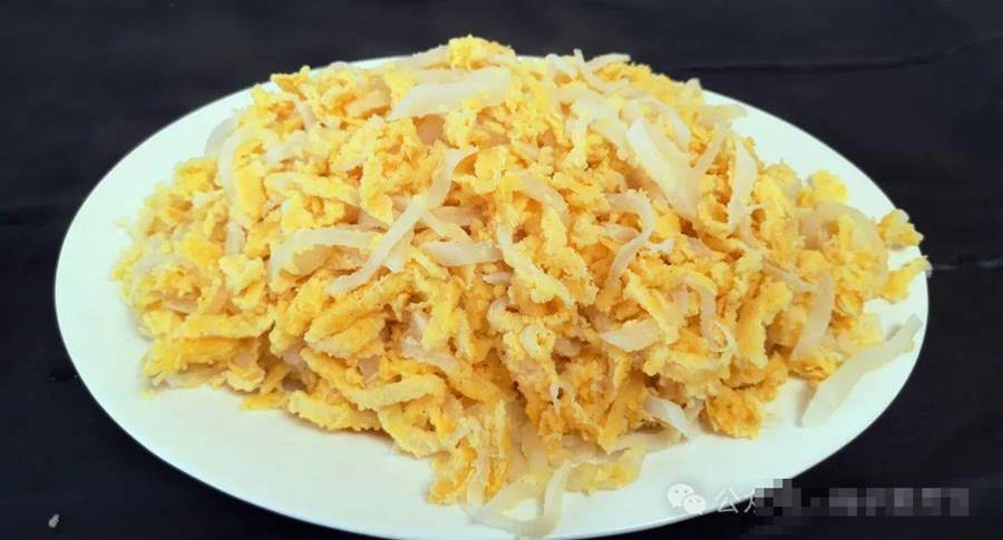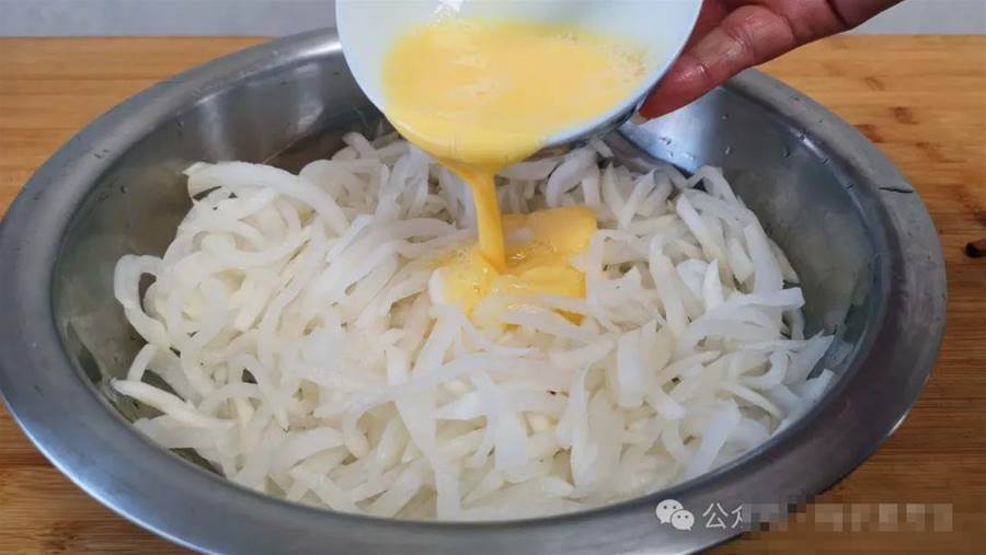 第二步、接著在碗中打入兩個雞蛋,給它攪散備用。大概十分鐘,這個蘿卜已經腌制出很多水分了,這時將它攥干水分裝入另一盆中,然后再將打散的雞蛋液淋在上面,給它們攪拌均勻,讓每一根蘿卜上面都沾勻蛋液。