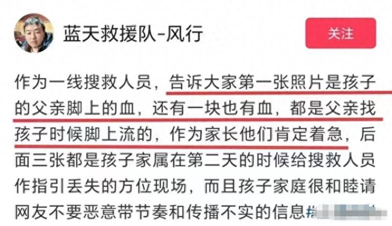 根據一名救援隊的隊員說,他為了找到孩子,腳都被磨破了,流著血也絲毫不在乎,他的內心肯定是非常著急的。一直都在現場為救援隊指引丟失的方位。所以希望大家不要再去過多指責這位父親了,也不要被惡意帶節奏。
