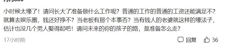 不過網友的擔憂顯然多余了,甚至有點「坐井觀天」的感覺,不知道世界之大,有錢人遠比我們想象要多,馬云的孩子都沒有擔憂做什麼工作,王思聰自己也非常厲害有自己的公司,他們根本不需要別人擔心的呀。與其擔心別人的孩子不知道如何生活,不如先看看自己,自己是否能夠給孩子創造一個美好的未來。