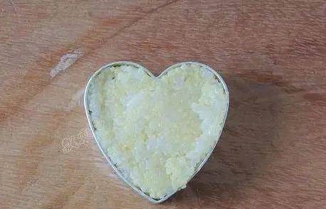 9.先舀一勺米飯到模具里面,鋪平,勺子蘸一點涼白開水就不沾了,更容易操作。
