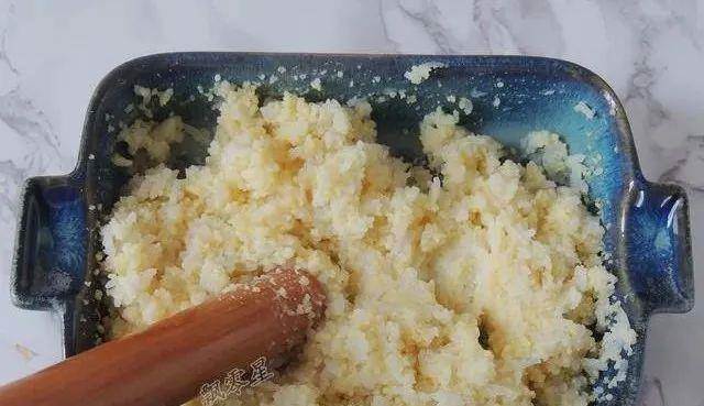 7.趁熱用搟面杖的一端將米粒搗碎,盡量搗碎一些,口感會更加細膩。有點像做年糕的步驟。