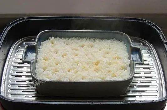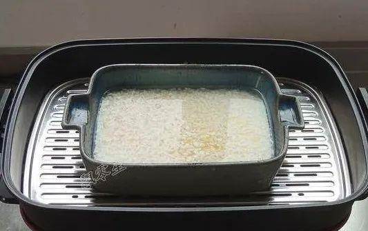 5.多功能鍋中加入適量清水,放入蒸格,將裝米粒的碗放在蒸格上,大火蒸三十分鐘左右。